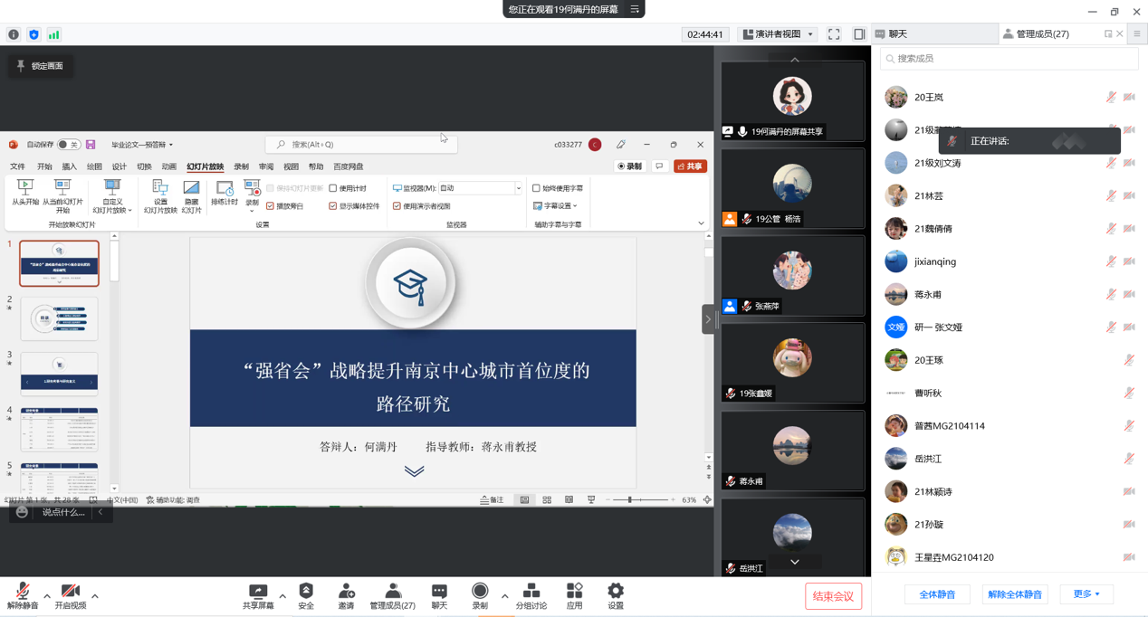 本次预答辩的顺利举行,为2019级研究生按时、高效、保质保量完成毕业论文提供了保障,推动同学们的论文写作水平向着更高层次、更高水平进步;同时2020、2021级研究生也积极参与旁听、观摩学习,加深对毕业论文选题的思考。