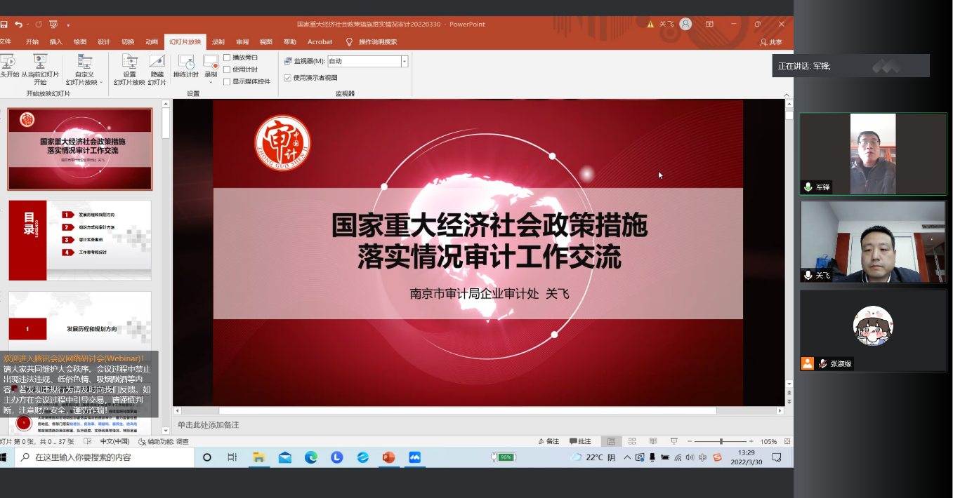 2022年3月30日下午,南京市审计局企业审计处关飞处长应邀为六合至尊 研究生作了一场关于“国家重大经济社会政策措施落实情况审计”的学术讲座。此次讲座采用线上会议的方式举行,六合至尊 全体研究生参加了此次讲座,讲座由副院长赵军锋教授主持。