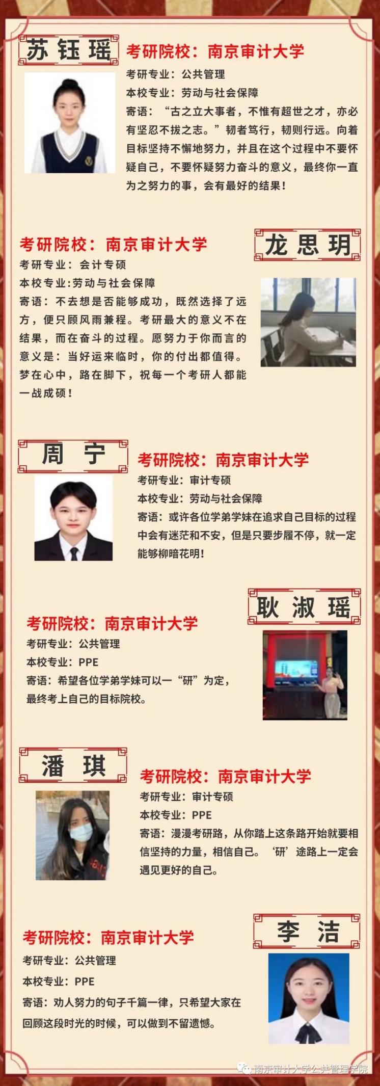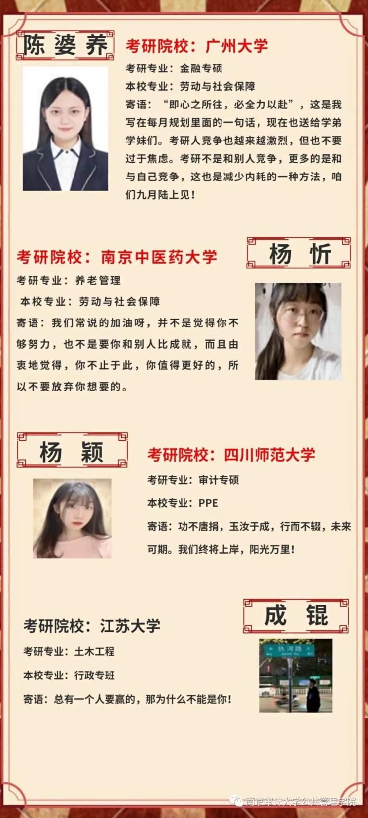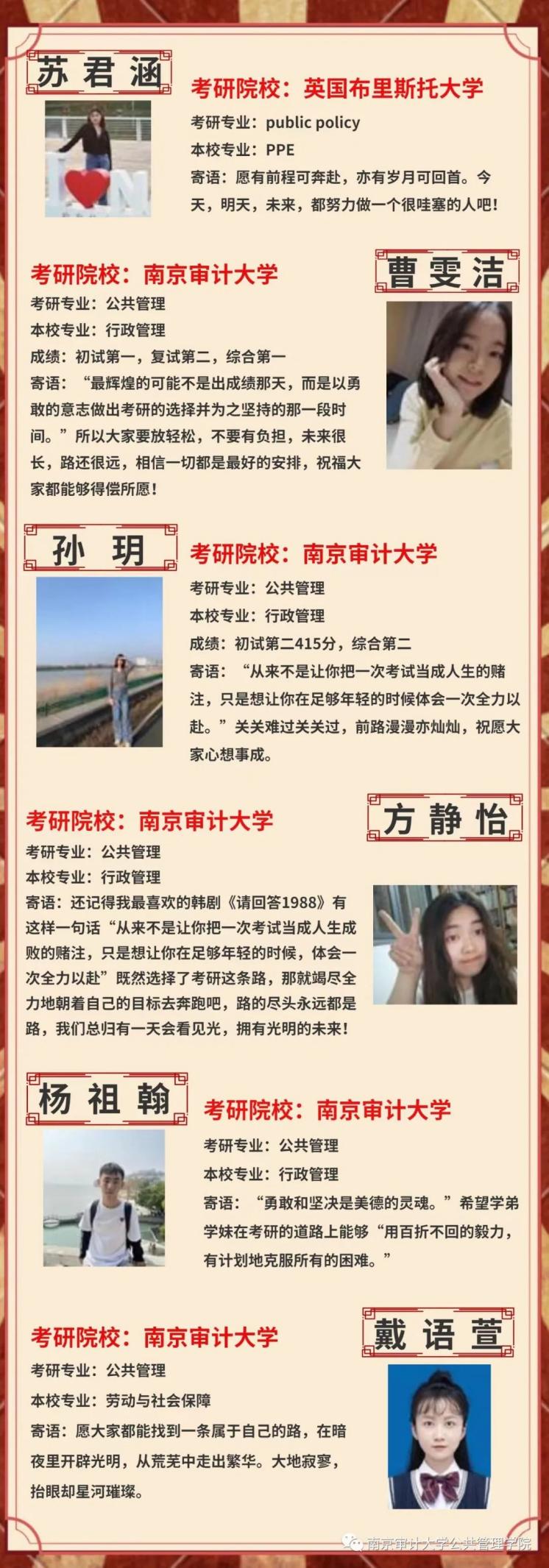 看到这里,大家是不是已经开始在心里默默羡慕学霸们的好成绩并且感叹他们的自律了呢?接下来让我们一起阅读考研上岸的学长姐的相关简介和对学弟学妹们的寄语,了解一下学霸的学习生活,从中获得更多考研备考经验。还在等什么,快来看看吧!