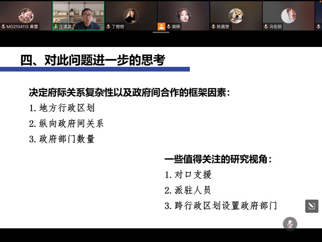 讲座伊始,汪建昌副教授从多个维度论述了政府间合作的必要性。他指出,政府部门的职能存在交叉和重叠,各部门根据自己掌握的信息和数据,各自为政,会致使跨区域、跨部门间协调困难,整体效能低。紧接着,汪建昌副教授介绍了西方和中国学者的相关研究。他从政府间关系、整体政府、政策协同三个方面对西方学者的理论进行梳理,并进一步从府际关系的概念、内涵、类型以及区域公共管理对中国学者的相关研究进行详细介绍。随后,汪建昌副教授从大部制改革、联席会议、行政区划等五个角度谈及中国政府的实践和创新。最后,汪建昌副教授指出影响府际关系复杂性及政府间合作的框架因素,并提出一些值得关注的研究视角。