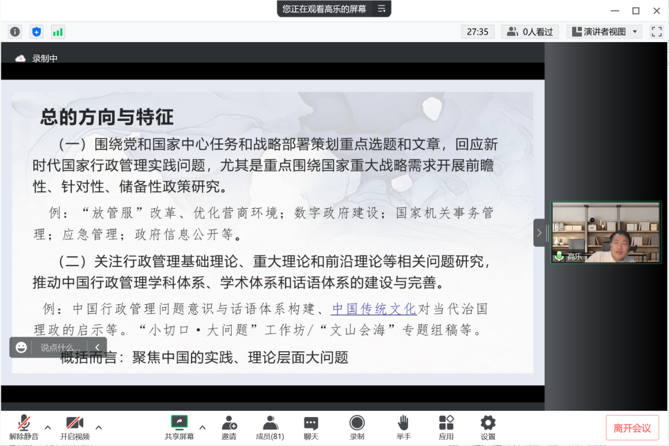 2022年9月28日晚,中国行政管理杂志社专职编辑、副编审、行政管理博士高乐给六合至尊 学生带来了主题为“《中国行政管理》期待怎样的文章”的学术讲座。本次讲座依托腾讯会议平台展开,由六合至尊 副院长赵军锋教授主持并点评。