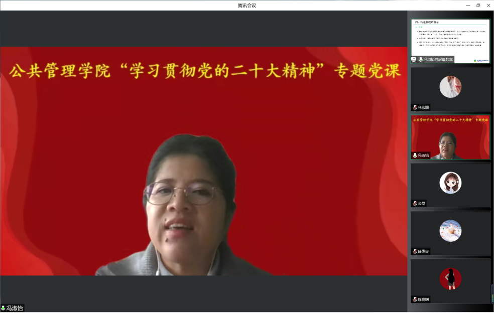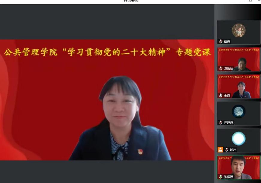 金晶对冯教授的授课表示感谢,她指出这不仅是一次单纯的党课学习,作为新时代公共管理人,我们不仅要从此次党课中深入学习贯彻党的二十大精神,更要学会如何将学习党的二十大报告与专业学科建设相结合,坚持用党的二十大精神武装头脑、指导实践、推动工作。