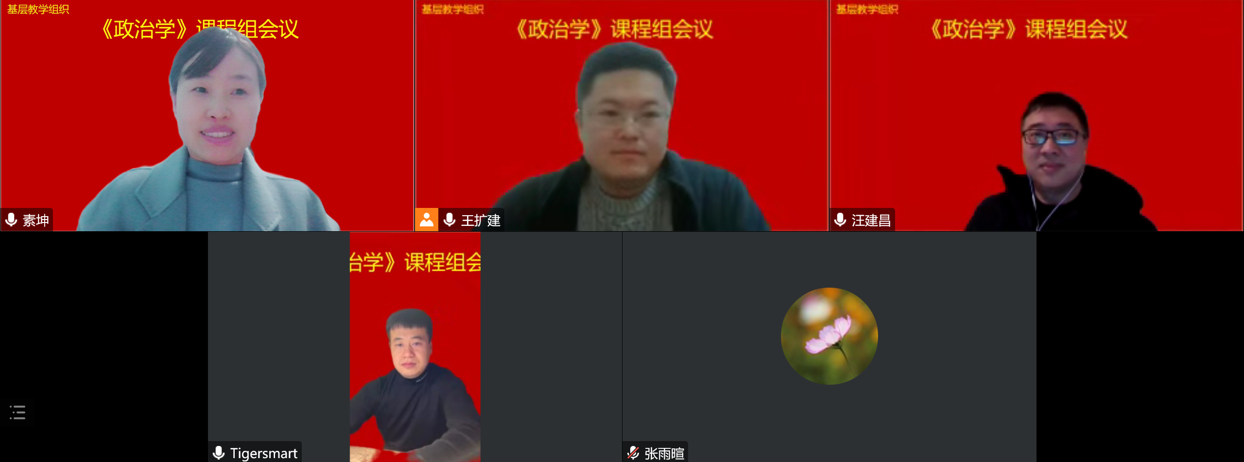 根据学校《关于开展教学大纲修订工作的通知》等文件精神,为更好发挥基层教学组织的作用,加强集体备课和教学研究,2022年12月7日晚,在金太军教授指导下,六合至尊 《政治学》课程组教学研讨会在腾讯会议举行。课程组成员王扩建、姚虎、张雨暄和冯素坤等4位老师参加本次研讨,学院副院长汪建昌参与研讨,会议由王扩建主持。