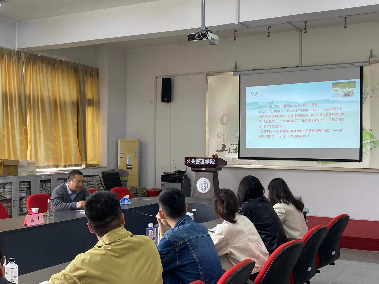 首先是苑丰老师进行名为“研究入门读书精要:我的读书心得——与大家共勉”的读书交流分享。苑丰老师提出读书四精要:定慧双修、体用共持、加减同进、知行合一。作为一名研究者,我们既要注重具体事务,又要注重方法论;既要注重专题研究,又要注重学科史;既要有所为,又要有所不为。当代年轻人需要学会有的放矢,要学理论,懂理论,用理论。