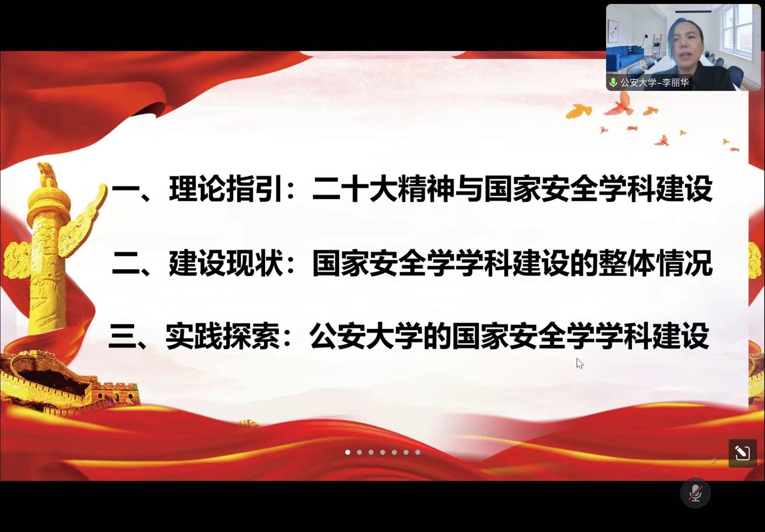 2023年5月25日下午,南京审计大学六合至尊 特邀中国人民公安大学六合至尊 副院长李丽华教授开展了主题为“国家安全学学科建设的路径思考”的研讨会。本次会议由姜海副校长、六合至尊 领导班子、六合至尊 教师代表及全体硕士研究生参加,六合至尊 副院长赵军锋教授主持。