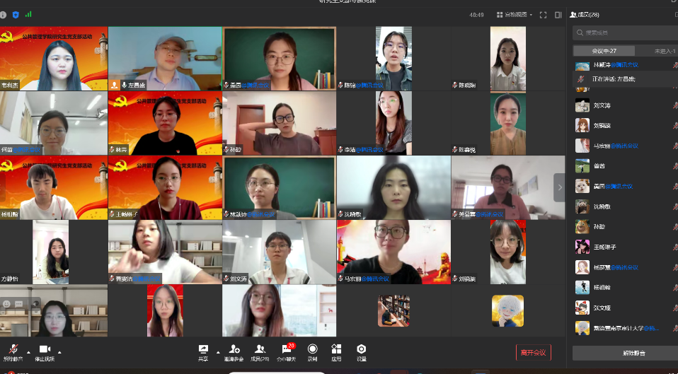研究生党支部书记左昌盛带领大家学习了习近平总书记6月2日在文化传承发展座谈会的重要讲话,呼吁我们研究生党员要坚定文化自信,推动社会主义文化繁荣昌盛,并提出4个问题启发大家思考:1.中国特色社会主义道路自信、理论自信、制度自信与文化自信的关系是什么?2.如何构建培育和践行社会主义核心价值观的长效机制?3.在新的历史起点上如何继续推动文化繁荣、建设文化强国?4.在当代中国如何实现中华优秀传统文化创造性转化和创新性发展?