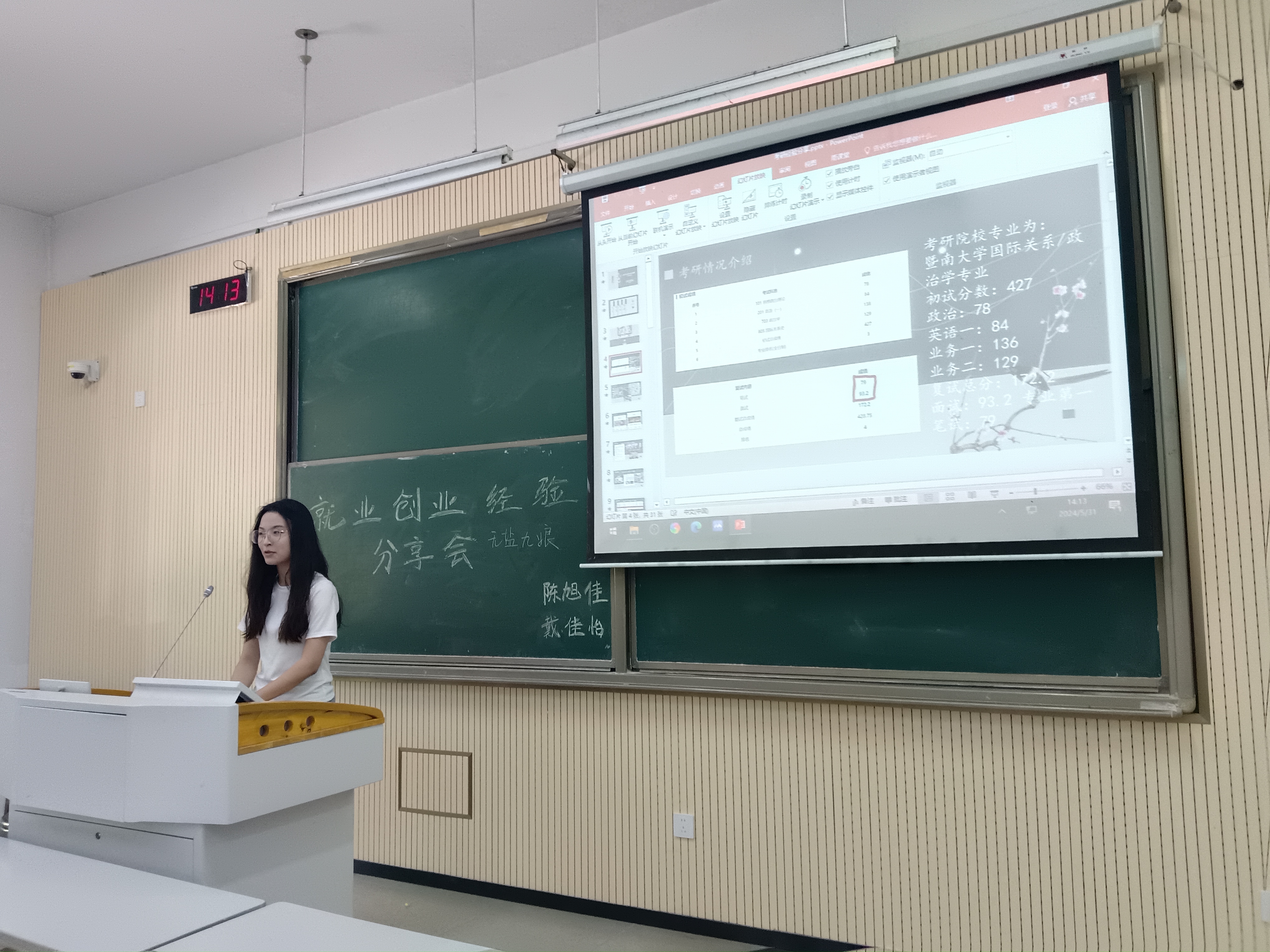戴佳怡学姐以427分的初试高分成功上岸暨南大学。学姐从如何面对人生的曲折与机遇出发,向大家展现了自己看待事情的乐观态度。在品牌策划大赛中,由于对方公司不愿意交出企业授权书,关键时刻学姐挺身而出,奔赴外地与公司进行交涉,最终在比赛中获得了国家二等奖的好成绩。学姐鼓励同学们要“勇敢探索世界,真诚对待世界”,成为勇敢的追梦人。