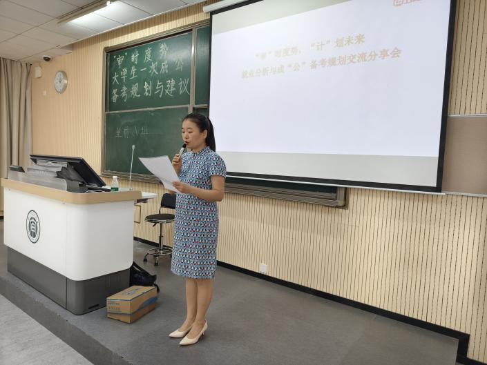 汪建康老师为到场的学生介绍了主讲单位和主讲老师,上岸公考是拥有多年公职考试信息咨询及笔、面试辅导经验的江苏本土专业教育培训机构,业务涵盖公务员、事业单位、人才引进、选调遴选、三支一扶等体制内招录考试培训。汪建康老师提醒同学当下就业、考公压力较大,希望各位同学在这场交流会中能够尽早梳理自己的目标,提前做好准备。