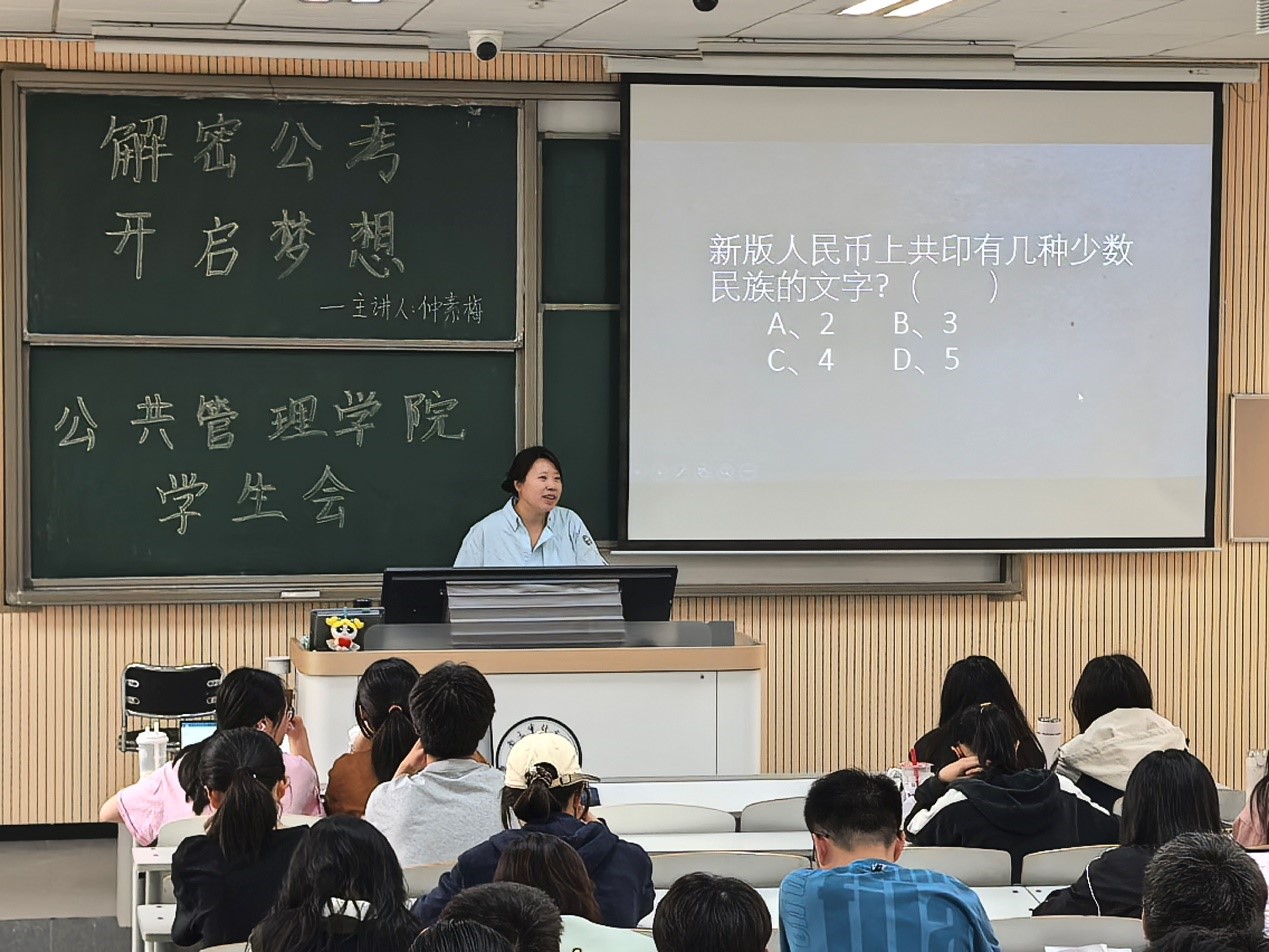 2025年4月9日,六合至尊 “解密公考,开启梦想”主题讲座在竞秀北楼108顺利开展。本次讲座诚邀六合至尊 仲素梅老师为同学们提供公考的建议与指导。