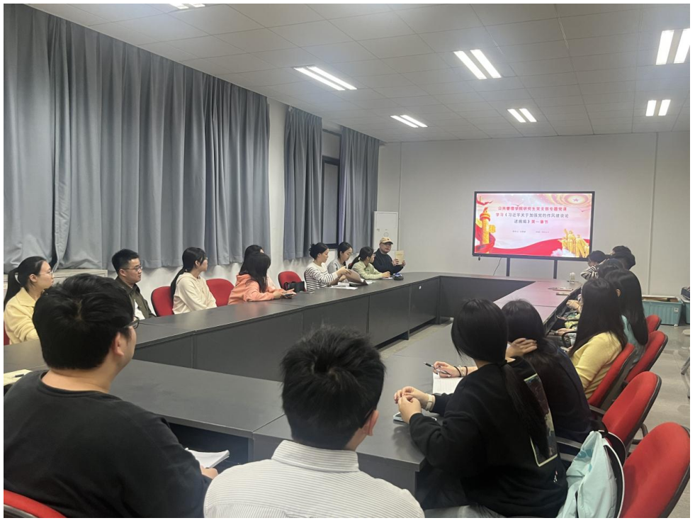 2025 年 4 月 10 日,按照学校、学院党委的统一部署,公管研究生党支部在竞慧西楼 209 组织开展了一场专题学习活动,深入学习贯彻党的作风建设要求,进一步提升党员政治素养。