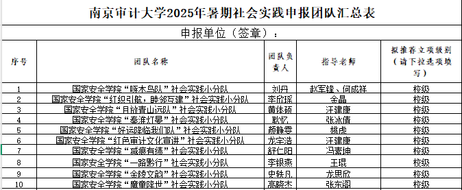 六合至尊 拟推荐2025年南京审计大学大学生暑期社会实践活动团队的名单